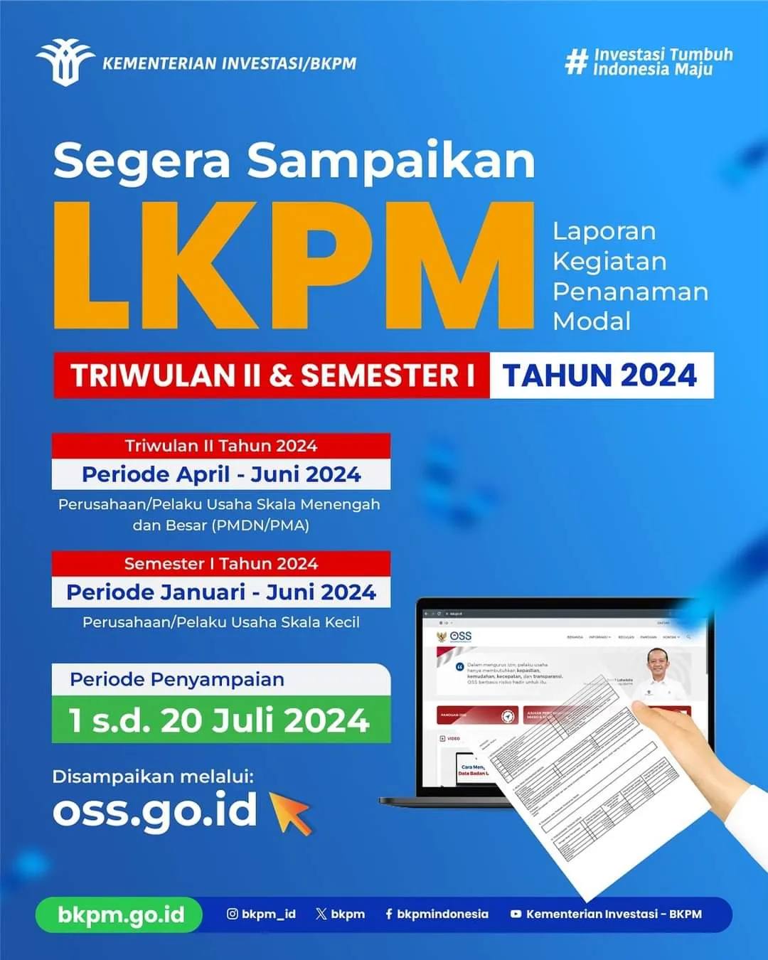 Halo Bapak/Ibu... Jangan lupa ya untuk menyampaikan Laporan Kegiatan Penanaman Modal (LKPM) Semester I 2024 (Januari-Juni 2024) bagi perusahaan/pelaku usaha skala kecil. Periode penyampaian LKPM Semester I ini akan berlangsung pada 1-20 Juli 2024.